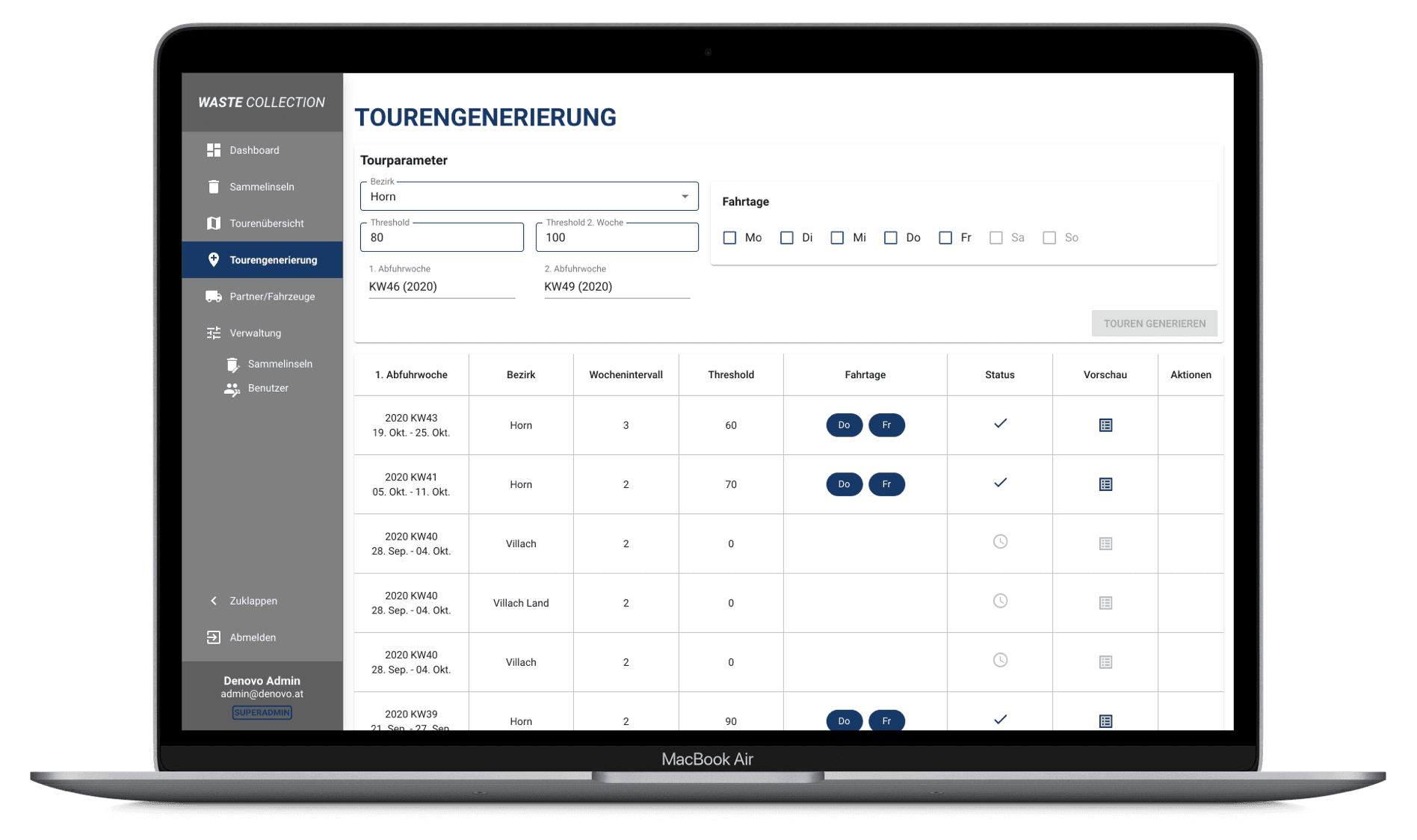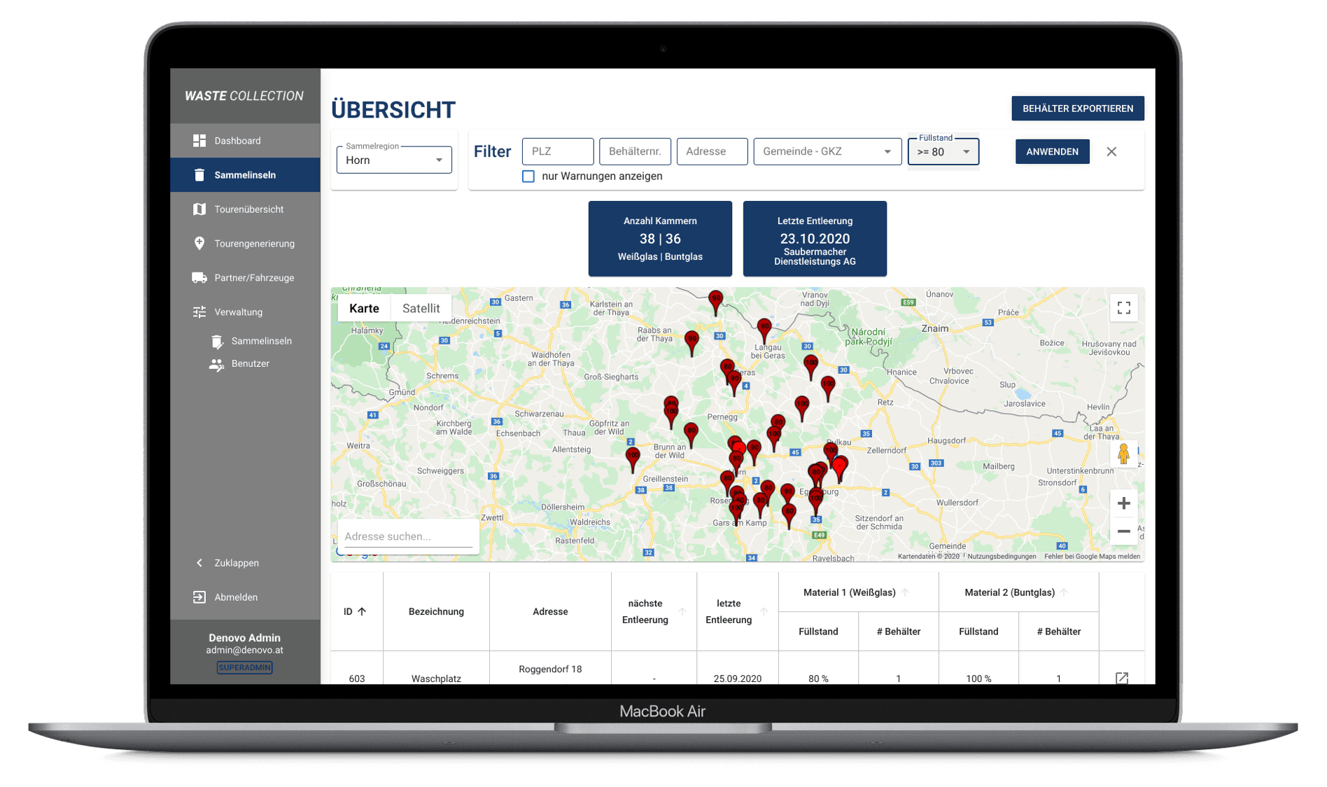 Der Sensor ANDI meldet dem Waste Collection Portal von Saubermacher in Echtzeit den Füllstand der Müllbehälter. Dieser Wert bildet die Grundlage für die bedarfsgerechte Routenplanung. Zu Beginn des Arbeitstages zeigt das Tablet der Fahrer:innen bereits eine optimierte Route, die so angepasst ist, dass nur Sammelbehälter angefahren werden, die voll sind. Dadurch werden Ressourcen und Zeit eingespart. Außerdem kann der CO2 Ausstoß erheblich verringert werden. Gemeinsam mit dem, ebenfalls von Denovo entwickelten, Wertstoffscanner, bildet das Waste Collection Portal die Grundlage zur intelligenten Abfallwirtschaft 4.0 von Saubermacher.
