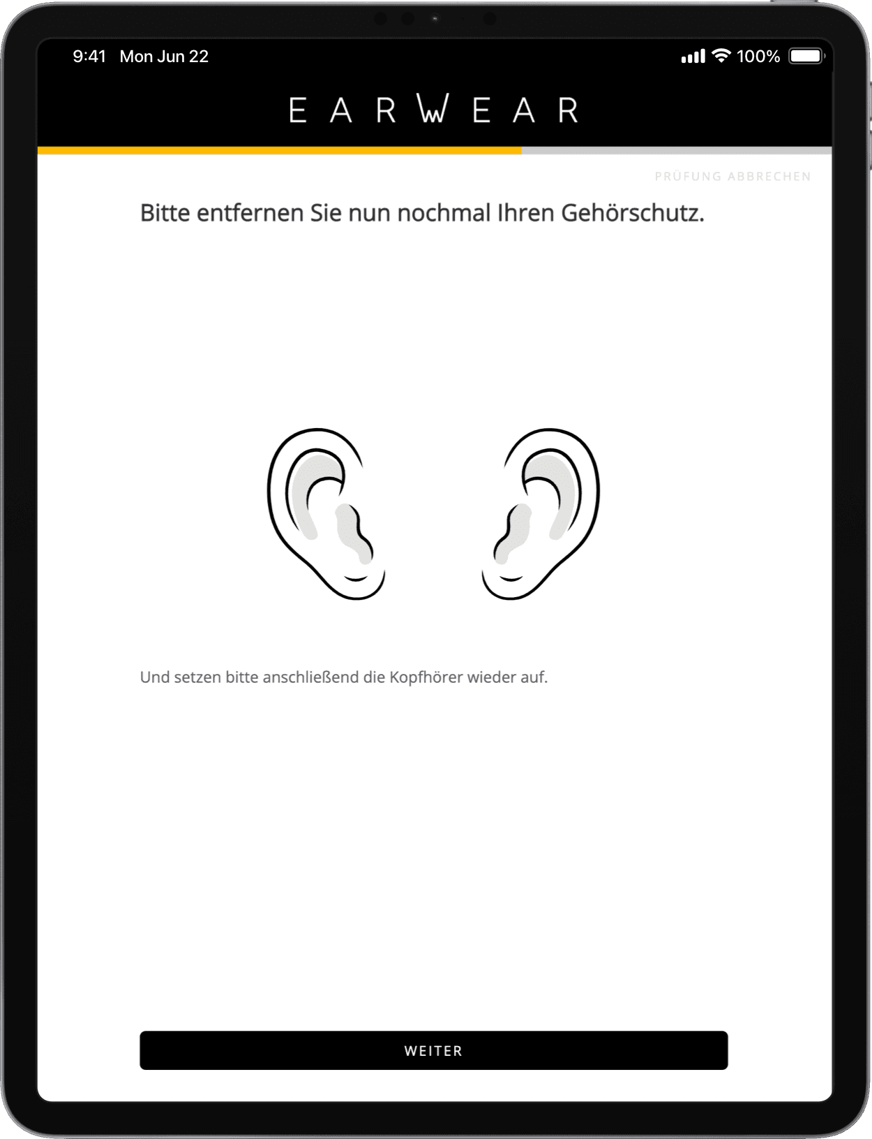 At the beginning, the name and data on the hearing protection must be entered. The test can then be performed with either loudspeakers (?) or over-ear headphones. Each ear is played a tone in the test process, once with and once without hearing protection. By measuring the difference, valuable knowledge about functionality can be gained.